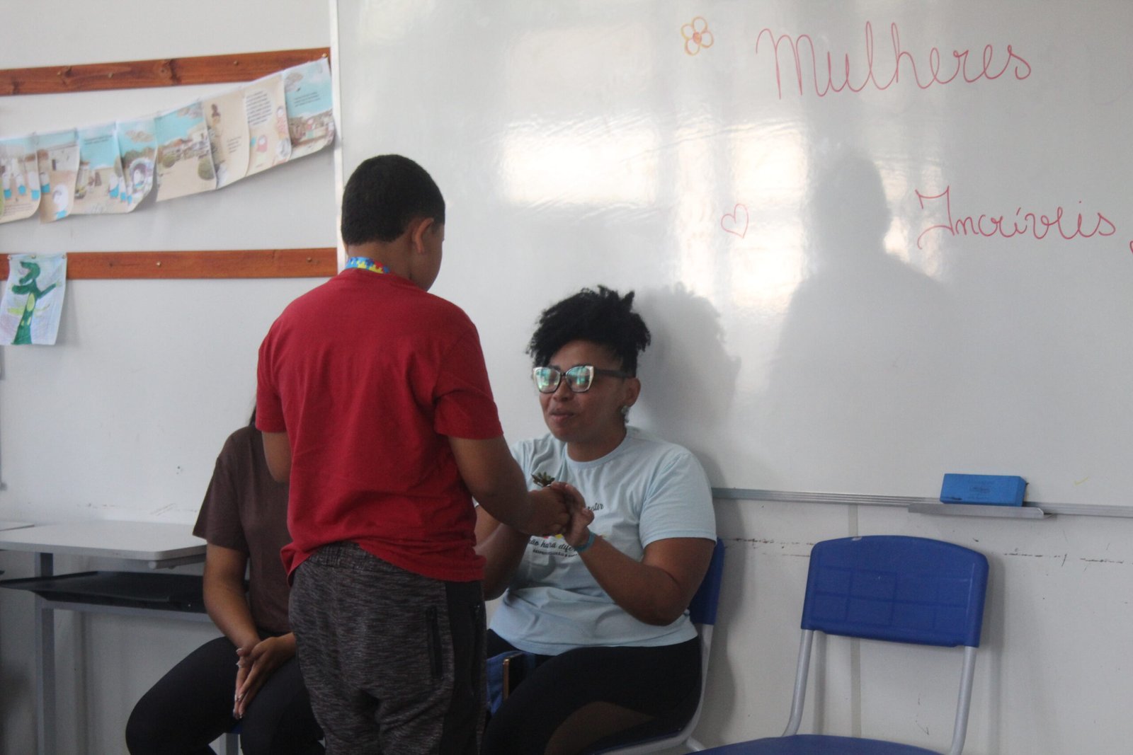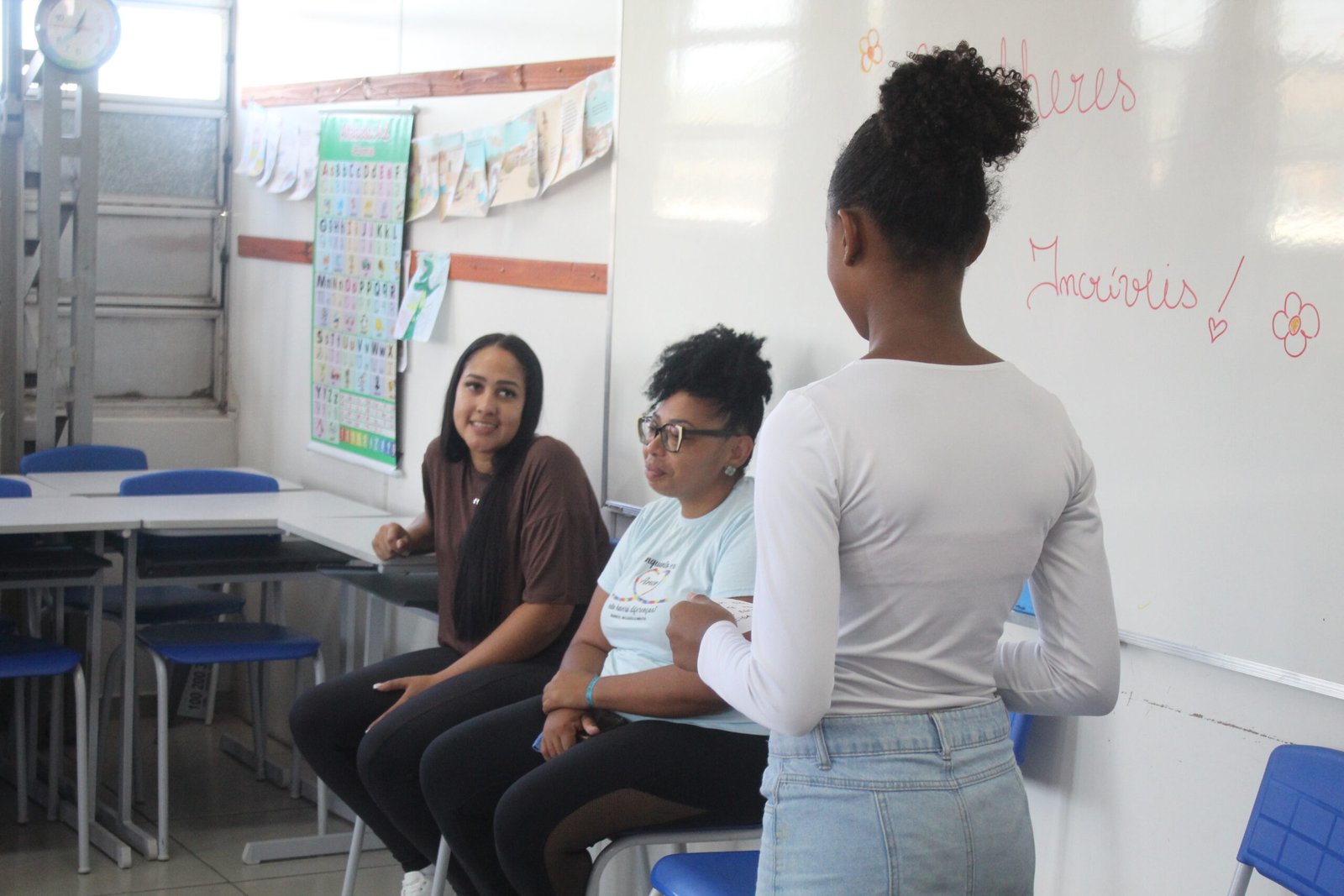 Nos terceiros anos, o encontro foi com a professora Ana e com Vitória, mãe da aluna Ana Clara, em um momento marcado por diálogo e troca. Já nos quartos e quintos anos, as turmas receberam as mães Laura, da aluna Malu, e Elisandra, mãe do aluno Adryan.