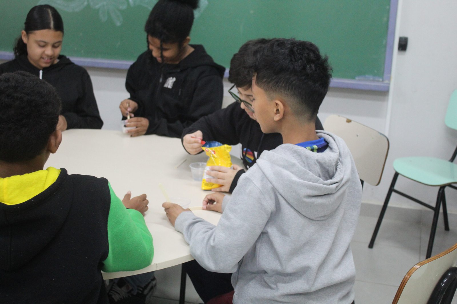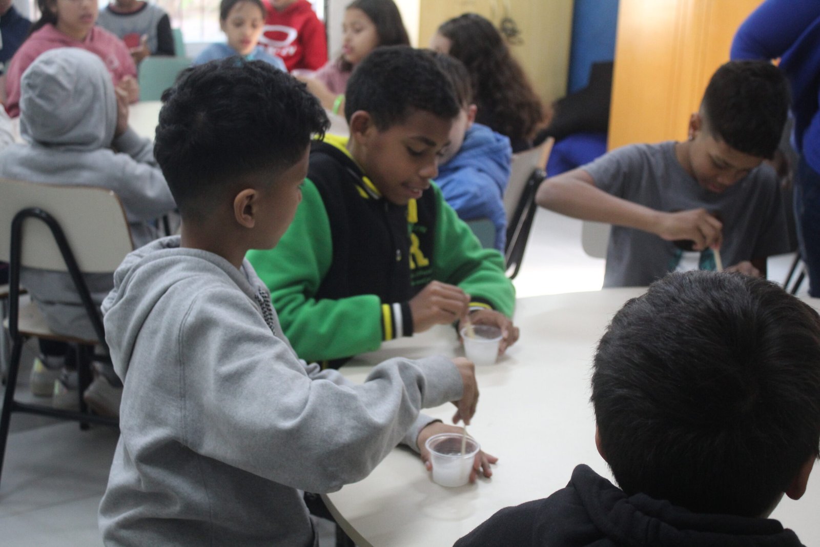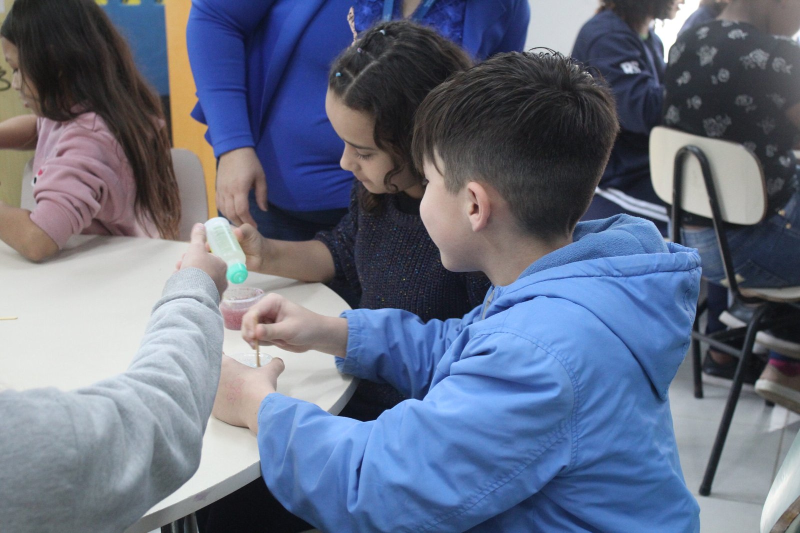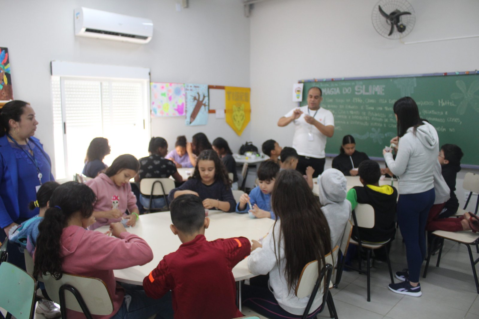 A proposta foi a produção de slime, uma massa colorida e elástica que diverte crianças no mundo todo. Utilizando materiais simples como cola e glitter, elas exploraram texturas, cores e possibilidades criativas, exercitando a curiosidade e a coordenação motora.